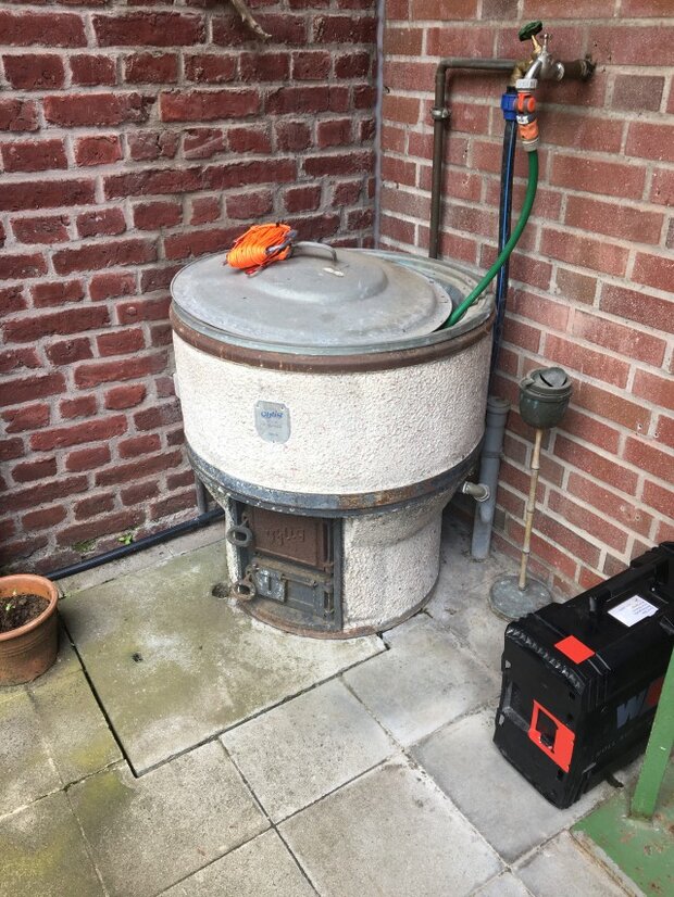 Hier kann der Wäschekessel schon mit Wasser aus dem Kran gefüllt werden. Vor der Verlegung der Wasserleitungen geschah das Eimer per Eimer.