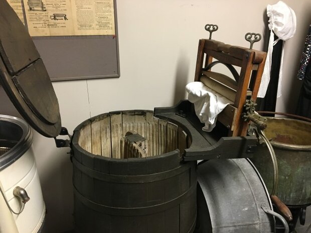 Dann wurde die heiße Wäsche mit einem langen Holzstab in einen Holzbottich gehievt, der mit Wasser gefüllt war und einen elektrischen Anschluss hatte. Durch einen Rotor wurde die Wäsche hin und her bewegt. Zuletzt drehte man sie per Hand durch eine Mangel. Anschließend mussten aber noch beide Wasserbehälter Eimer per Eimer geleert werden.