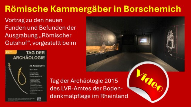 > Info - 01.12.2025 - Im Archiv gekramt: "Römische Kammergräber in Borschemich" - Bericht zum Tag der Archäologie 2015 - Der Vortrag mit ppt-Präsentation im Rahmen der "Wegberger Seminare" ist jetzt als Video zu sehen. > News & Views - Archäologie