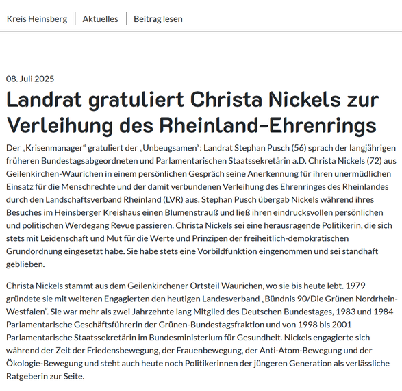 Der Landschaftsverband Rheinland (LVR) hat gestern die ehemalige Politikerin und engagierte Ehrenamtlerin Christa Nickels mit dem Ehrenring des Rheinlandes ausgezeichnet. Der Ehrenring ist die höchste Auszeichnung, die der LVR vergibt.