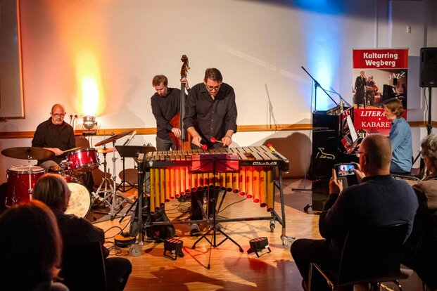 Ein besonderes Jazzkonzert in der Wegberger Mühle mit André Spajic am Schlagzeug, Stefan Rey am Bass, Matthias Strucken am Vibrafon und Gero Körner am Piano. Foto: Ruth KlapprothOktober 2025