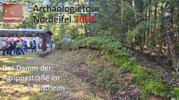 Im Forst Schmidtheim bei Dahlem verbirgt sich ein 2,7 Kilometer langer Straßendamm aus römischer Zeit. Er ist ein besonders gut erhaltener Abschnitt der Agrippastraße. Sie verband die römischen Provinzhauptstädte Köln und Trier miteinander und verlief weiter über Lyon bis ans Mittelmeer. Vor Ort erklären Archäolog*innen den Aufbau einer römischen Fernstraße anhand des Straßendamms.