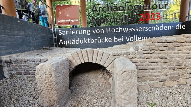 Durch das verheerende Hochwasser im Juli 2021 waren viele Menschen betroffen. Zahlreiche Gebäude, aber auch Bodendenkmäler erlitten Schäden. Diese wurden zur Entlastung der Kommunen durch ein eigenes Projekt des LVR-ABR systematisch erfasst. Dazu gehörte auch die Aquäduktbrücke bei Mechernich-Vollem. Sie ist Teil der Eifelwasserleitung, die einst das römische Köln mit Trinkwasser versorgte. Die Schäden wurden von einem Steinrestaurator behoben, der bei der Archäologietour seine Arbeit erklärt.