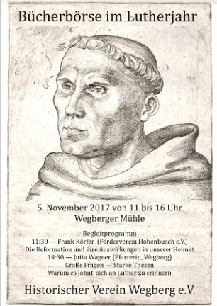 Auch in diesem Jahr lud der Historische Verein Wegberg e.V. für Sonntag, den 05.11.2017 von 11.00 bis 16.00 Uhr zur jährlichen Bücherbörse in die Wegberger Mühle ein. In diesem Jahr lag es nahe, sich des Themas „500 Jahre Reformation“ anzunehmen. Dazu wurden zwei Referenten gewonnen, die dies aus geschichtlicher und theologischer Sicht darstellten.