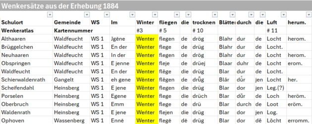Der oben gezeigte Verlauf der „Benrather Linie“ konnte von Wenker hier nicht festgestellt werden, wohl aber ein grün schraffiertes Gebiet mit der Variante „Wöngter“, das dem ripuarischen Sprachraum zugerechnet werden kann.