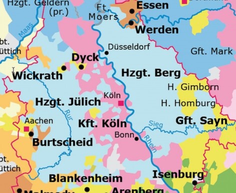 Die Grafschaft Berg (ab 1380 Herzogtum) zählte im Hoch- und Spätmittelalter zu den bedeutendsten rheinischen Territorien. Sie gehörte zum Niederrheinisch-Westfälischen Reichskreis und erstreckte sich rechts des Rheins. 1789 wurde sie im Norden vom Herzogtum Kleve, dem Reichsstift Essen und der Reichsabtei Werden begrenzt. Im Osten lagen die Grafschaft Mark, die Reichsherrschaft Gimborn-Neustadt, die Herrschaft Homburg und das Herzogtum Westfalen, das zum Kurfürstentum Köln gehörte. Im Süden grenzte Berg an die Sayner Grafschaften und im Westen an den Rhein beziehungsweise das weitgehend linksrheinisch liegende Kurfürstentum Köln und die Stadt Köln. Die Lage zwischen Kurköln und dessen westfälischen Besitzungen hatte erheblichen Einfluss auf die politischen Beziehungen zwischen den Territorien Berg und Kurköln, da alle strategisch wichtigen Verbindungswege nach Westfalen durch bergisches Herrschaftsgebiet führten.