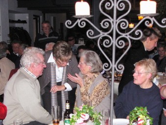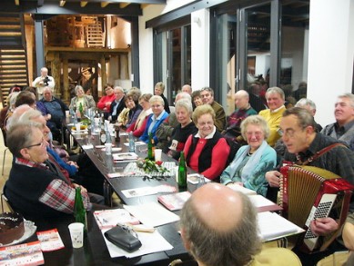 rechts: eine frohe Runde in der Wegberger Mühle, mit Reinhold Küppers am Akkordeon