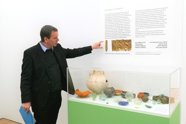 Auch das Grab eines „Magiers aus Tüddern“, das am Rand der römischen Siedlung vicus Theudurum bei Tüddern entdeckt wurde, wird präsentiert. Das Brandgrab aus der römischen Kaiserzeit des 40-60 Jahre alten Mannes, der an einer Kieferhöhlenentzündung und einer schweren Knochenhautentzündung des Schienbeins litt, war mit ungewöhnlichen Gegenständen ausgestattet.