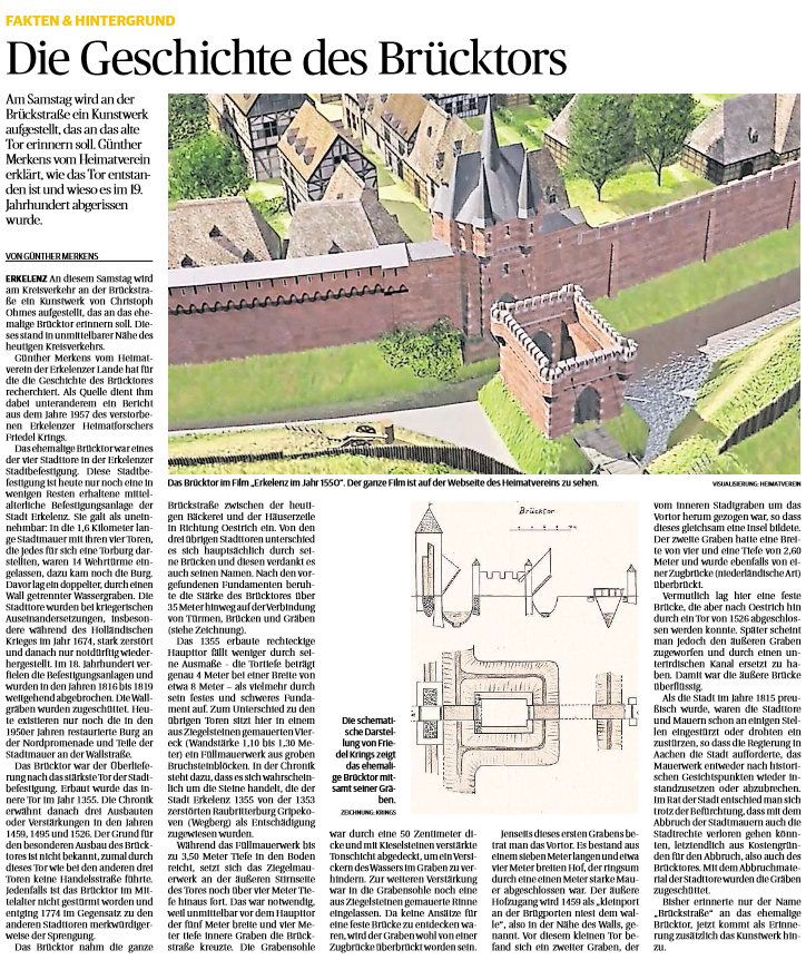 Am Samstag wird an der Brückstraße ein Kunstwerk aufgestellt, das an das alte Tor erinnern soll. Günther Merkens vom Heimatverein erklärt, wie das Tor entstanden ist und wieso es im 19. Jahrhundert abgerissen wurde.