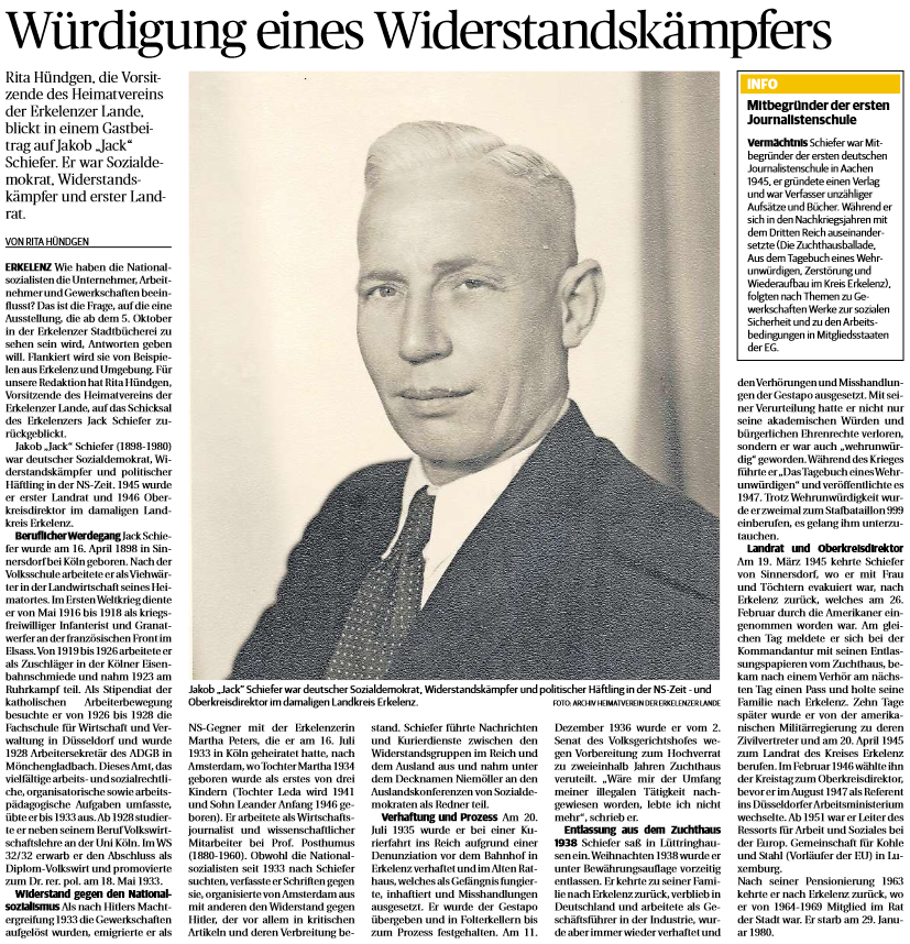 Rita Hündgen, die Vorsitzende des Heimatvereins der Erkelenzer Lande, blickt in einem Gastbeitrag auf Jakob „Jack“ Schiefer. Er war Sozialdemokrat, Widerstandskämpfer und erster Landrat.