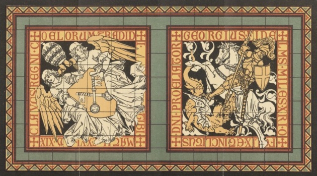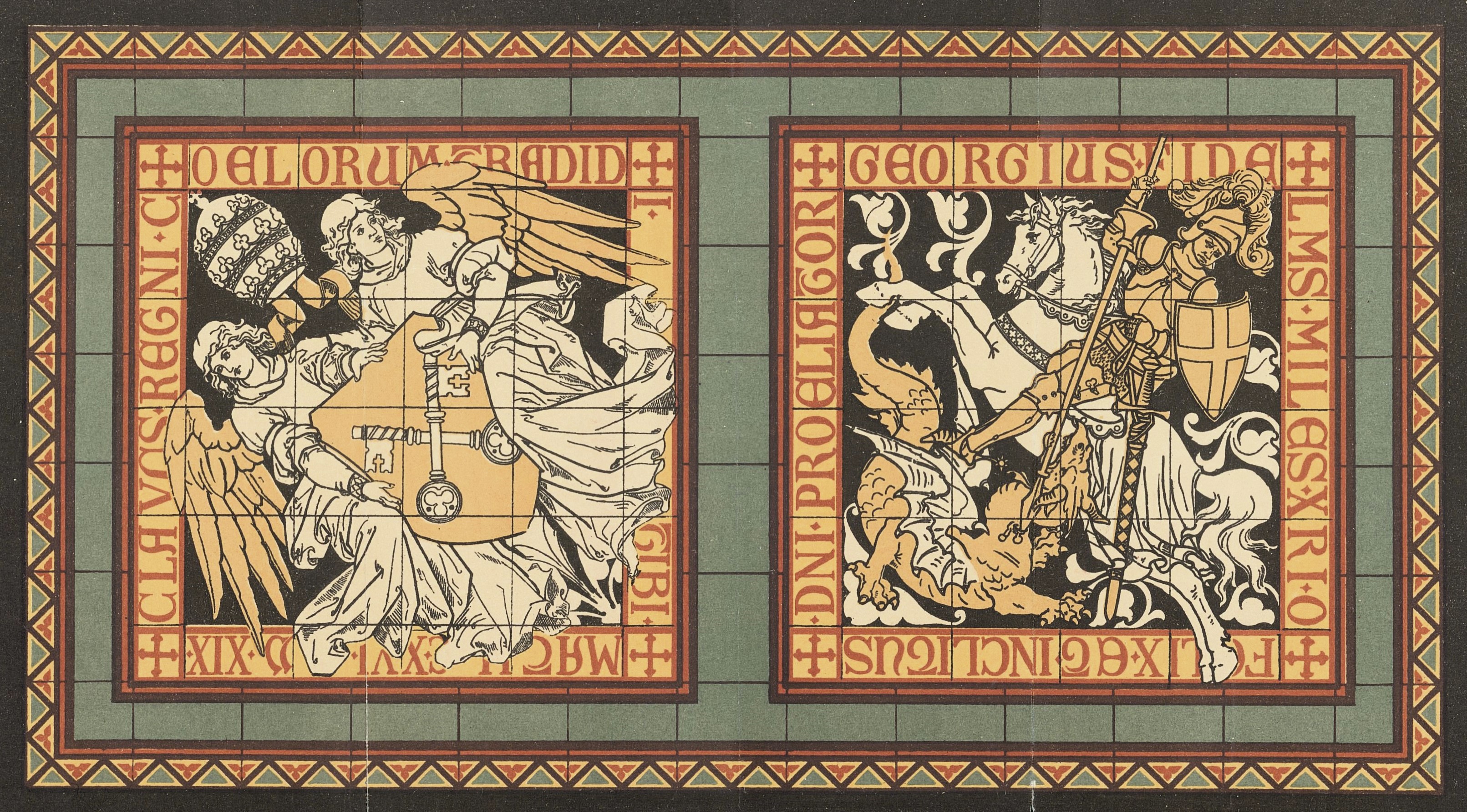Nach Auskunft von Frau Dr. Christa Grund vom Firmenarchiv Villeroy und Boch in Mettlach handelt es sich um zwei bekannte und recht seltene Motive, die in den Muster-Blättern der Mosaik-Fabrik von Villeroy & Boch (1886) unter der No. 516 ("St. Georg") und No. 517 ("Papstwappen") verzeichnet und im Jahre 1891 hergestellt worden sind.