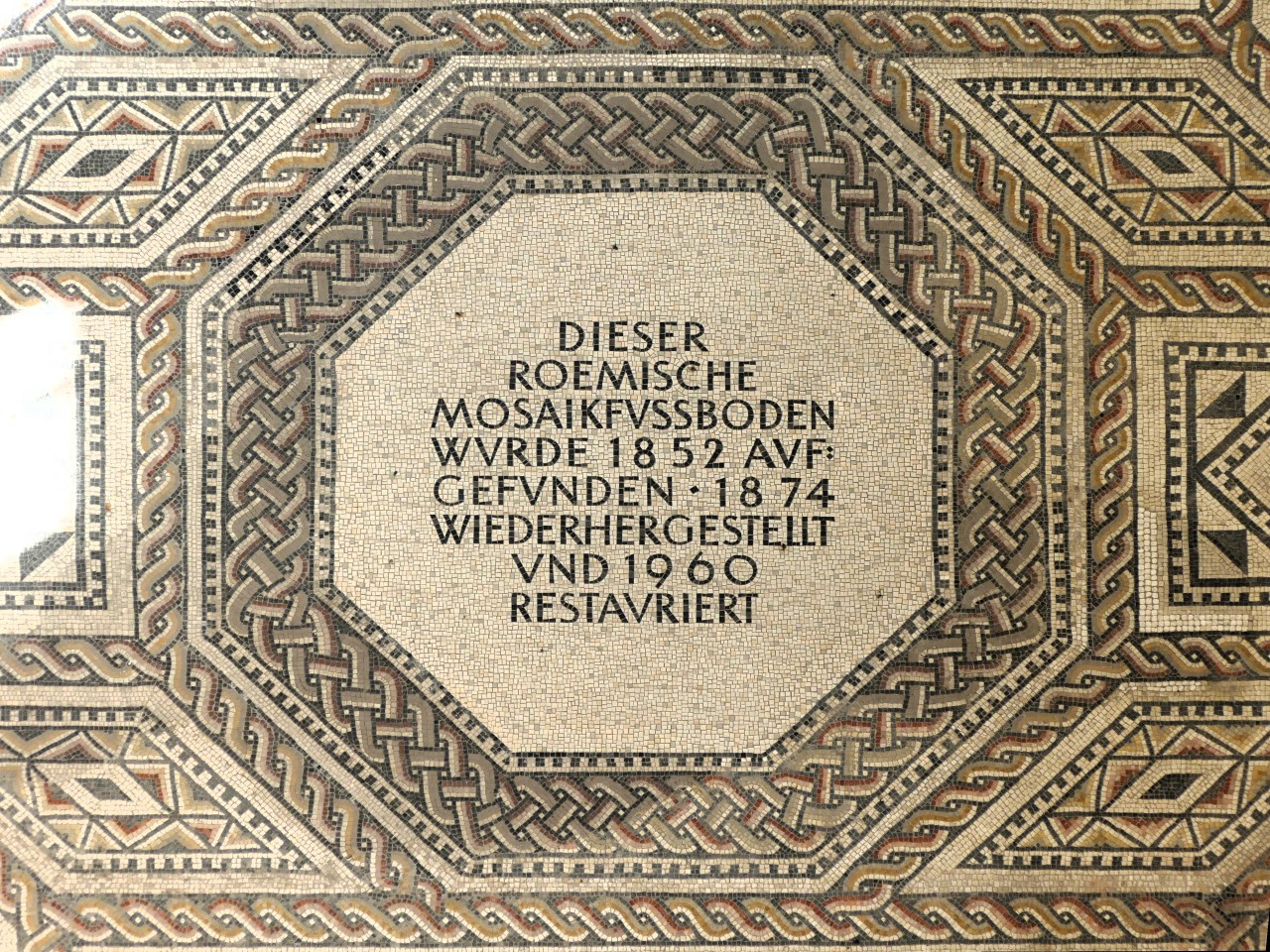 Gott sei dank sind in der Kirche St. Rochus bei der Neuverlegung der Tableaus - anders als in einigen anderen Kirchen geschehen - die umrandeten Text-Fliesen nicht vertauscht worden.