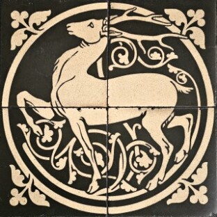 Im Übergang vom Kirchenschiff zum Altarraum findet sich ein Fliesenband mit einem weiteren typischen Tiermotiv von Villeroy & Boch: der Hirsch als Bezwinger des Bösen, eingerahmt mit den Mettlacher Platten No. 266.