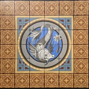 Ein weiteres, eher seltenes Fliesen-Motiv mit Pfauen aus Mettlach (No. 527) findet sich gleich mehrfach im Kirchenschiff. Bereits in der Antike war der Pfau das häufigste Symbol der Unsterblichkeit. Seine nachwachsenden Federn sowie die Haltbarkeit seines Fleisches machten ihn zum Symbol der Erneuerung, Unsterblichkeit und Ewigkeit.