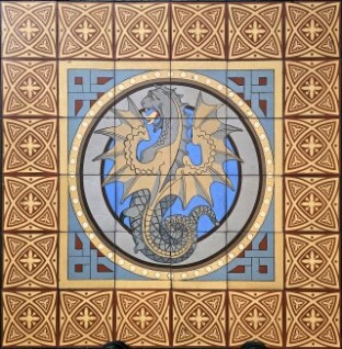 Das Tableau "St. Georg" besteht aus einem mehrteiligen Fliesenbild. Das innere Bildmotiv setzt sich wiederum aus 16 Bildfliesen zusammen, je 17 x 17 cm, insgesamt also 68 x 68 cm groß. Es zeigt St. Georg als Ritter auf einem Pferd im Kampf mit dem Drachen.