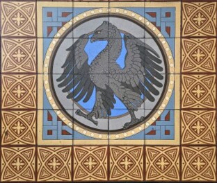 Fliesentableau "Sankt Georg im Kamof mit dem Drachen, eingerahmt mit Mettlacher Fries-Platten No. 266