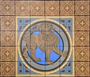 Schwieriger gestaltete sich die Erklärung des "Papstwappens". Die Darstellung gibt zunächst keinen Hinweis, um welchen Papst es sich handelt. Eine Bildsuche im Internet war hilfreich, als ich auf die Website "Die Geschichte der Fliese" von Wilhelm Joliet stieß und auf das Werksarchiv der Mosaik-Fabrik Villeroy & Boch in Mettlach aufmerksam wurde.