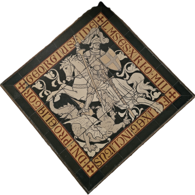 Vor dem Altarpodest im Kirchenschiff ist ein großes Fliesentableau in den Boden eingearbeitet, das Georgius oder den Heiligen Georg in Rüstung zu Pferd zeigt.