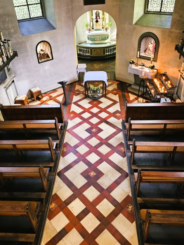 Gleich beim Betreten der Kapelle gewahrt man im Mittelgang die typischen Fliesen der Sinziger Mosaikfabrik mit verschiedenen Tier-Motiven.